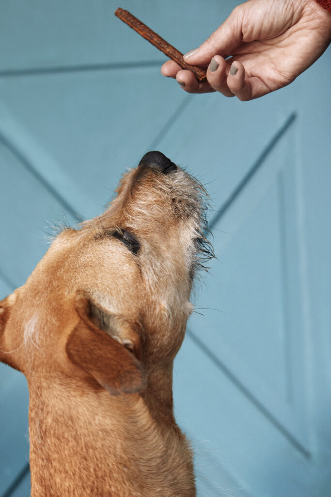 - Hold a treat close to your dog’s nose, letting them smell but not grab it (keep the treat close to their nose—too high, and they’ll jump).