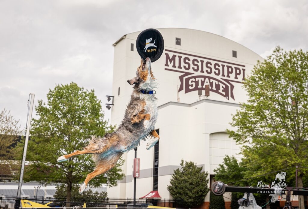 Since then, Frank has earned his Dock Master 5 (DMX5) title with 155 jumps in the Master Division, which covers distances of 20 feet to 23 feet, 11 inches. His personal best is 25 feet. He’s zig-zagged via RV all over the country—ten states and counting, from Texas to Florida, Ohio to Arizona. He’s appeared on ESPN twice for AKC Premier Cup events. At Mississippi State, he leapt 21 feet, 8 inches in front of cameras and cheering fans—which can make even confident dogs nervous.